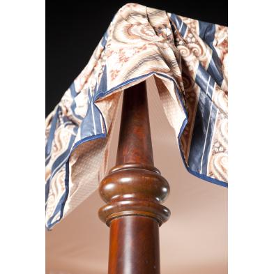 Early 19th century, mahogany with mahogany veneers, all four posts are tall and tapered with ring turnings and acorn tops, the headboard features double panels and broken arch scrolled pediment, raised on tall turned leg with suppressed ball foot. Included custom made and fitted box spring, mattress, draperies and bedding. Rail height 16 in.