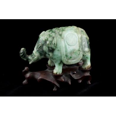 The stone of mottled apple and spinach green jade, each elephant modeled with blanket bearing Chinese symbols (i.e. Ying & Yang), with fitted wooden base.