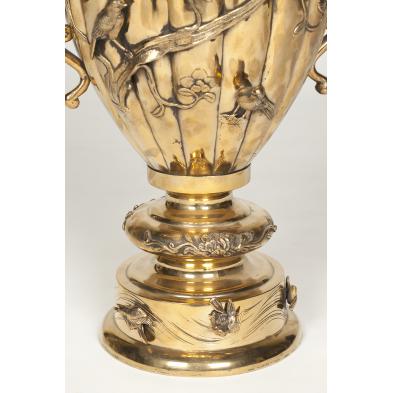 Early 20th century, likely designed to contain gentleman's walking sticks, having a wide mouth above a neck embellished with cast and applied flying cranes, the lobed body with other avian forms as well, hawk-head handles, hollowcast.