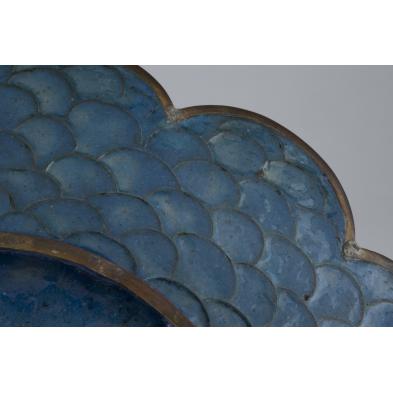 To include: a scalloped plate with central dragon (9.75 in.); a bowl with Arabesque design (2.5 x 12 in.); a small charger featuring a sparrow in flight above a garden, black field (12 in.).