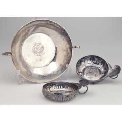 All centered with foreign coin, the smaller ones likely French, the two handled taster with 900 mark.