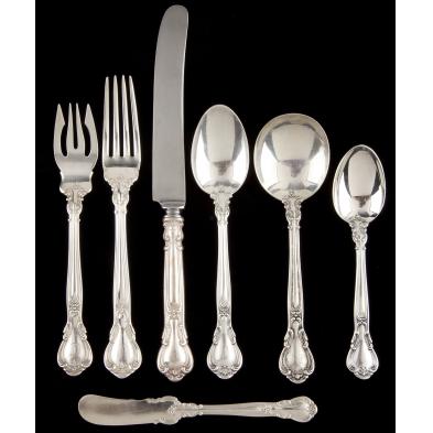 (79 pieces) including: (11) knives (9.5 in.); (9) forks (7.5 in.); (6) salad forks; (5) cocktail forks; (6) place spoons; (12) round soup spoons; (9) teaspoons; (6) iced tea spoons; (3) demitasse spoons; (6) flat handled butter spreaders; (2) piece carving set; sugar shell; and (3) tablespoons (one with damaged bowl). All with "C" monogram. Majority of pieces bear the early Gorham hallmark.