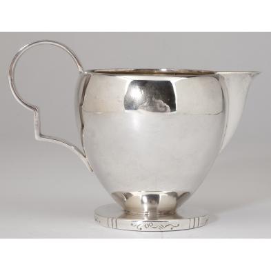 Likely designed by Svend Weihrach, with Danish hallmarks, produced in 1931, strong Art Deco form with stylized "calligraphy" design to round foot.