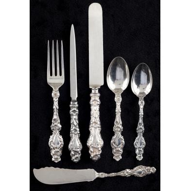(40) pieces including: (6) knives with French blades (8.75 in.); (6) blunt knives (8.75 in.); (12) forks (6 5/8 in.); (8) teaspoons; demitasse spoon; 5 o'clock spoon; (3) tablespoons; master butter knife; sugar shell; and letter opener by Gorham. No monograms. Housed in a fitted silver case.