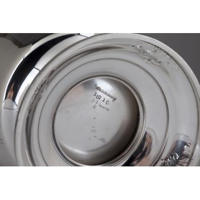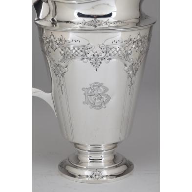By Jennings Silver Co., circa 1925, with chased foliate scroll band to shoulder, hold 3 1/2 pints, monogrammed "SGB."