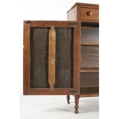 Mid 19th century, cherry, white pine secondary, two drawer form over double doors, punched tins to four sides, turned front feet.