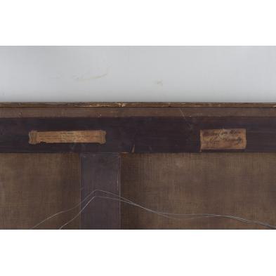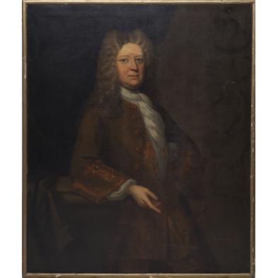 Oil on canvas (lined), three-quarter length portrait of a gentleman in brown embroidered coat, cravat, and wig; inscribed at the lower right "Rowland Eyre Esq.," inscribed on the verso "Rusel. Pinxt" and retaining two old paper labels - one attributing the painting to the Kneller School and the other reading "Belonging to the Eyre Family."