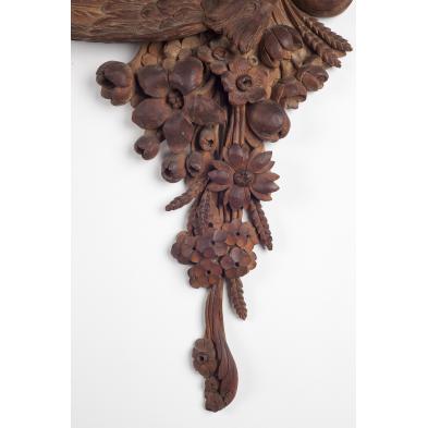 Likely Continental, each realistically hand-carved with a bird hanging upon a floral swag, trompe l'oeil peg and hook at top of panel.