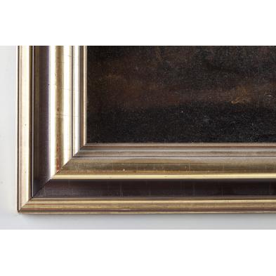 Oil on canvas (lined), both unsigned, the first depicting animals at rest in a bosky landscape under ominous clouds, the second depicting a weary traveler on horseback by a mountainous pass. Each in later matching frame.