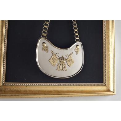 Late 19th - early 20th century, steel plate with stamped brass appliques, the central device being crossed regimental flags behind the Kaiser's monogram. Complete with linked brass chain and presented in an open gilt wooden frame.