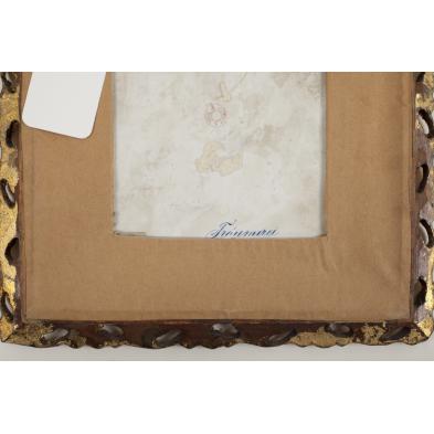 Depiction of a seated young woman, two cockatoos hovering nearby, executed with fine detail to the woman's features and the "gold thread" of her garments. Housed within a pierced gilt wood frame with burgundy velvet fillet. Pencil dated on the back "1892," with later export stamp, and, in blue ink, the title "Traumerei" (Reverie).