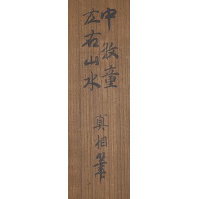 18th - 19th century, the paintings on later brocade mounts with polished bone ends, each scroll signed and stamped. The center scroll, featuring a herdsman leading a bull, is flanked by two scrolls showing mountain landscapes. The scrolls (73 x 23.5 in. DOA) are presented in a custom-made early 20th century wooden box (4.5 x 26 x 9 in.).
