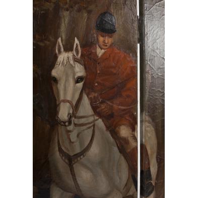 First half 20th century, hand painted with a scene of riders and hounds, wood panels with leather/brass tack bound borders.
