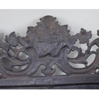Late 19th, the interior consists of a dovetailed wooden box divided into six storage compartments. A polychrome decorated cast metal architectural facade incorporates a pierced door backed with tin. Marked P. L. VOMBACH / OFFENBACH A/M on the back of the crest.