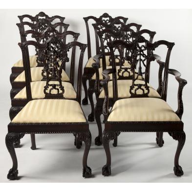 English, (2) arm and (6) side, mahogany, having shaped crest with carved foliate motif to ears and center, pierced back splat carved with trailing ribbons and long tassel, upholstered seat over cabriole legs with carved knee and ball and claw foot.