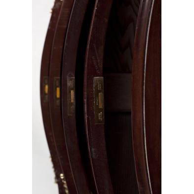 English Victorian Style, mid 20th c., serpentine form, figured mahogany veneers with pine secondary, writing slide over four graduated cock-beaded drawers, the case raised on ogee bracket feet. Upper drawer marked "Howard & Sons Ltd./Berners St/14385/2580."