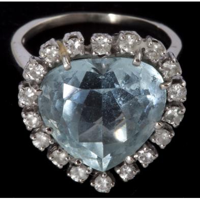 Set in the center with a beautiful heart shaped aquamarine of good saturation with a greenish blue hue, surrounded by 18 round full cut diamonds; the aquamarine and diamonds weigh 9.04 carats and .54 carat respectively, mounted in 14K white gold.