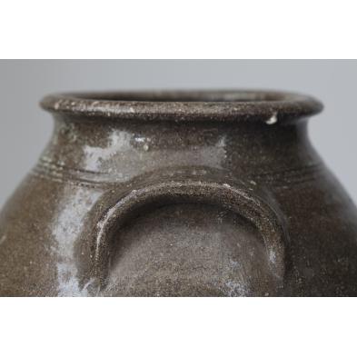 Catawba County,19th century, alkaline glazed stoneware, two gallon size, with double lug handles and straight incised line decoration, stamp "TR" and "2" indicating gallon capacity to one handle.
