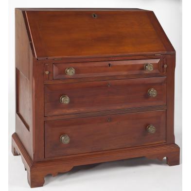 American, early 19th century, white pine and poplar secondary, the interior divided with eight small drawers and pigeon holes over three graduated beveled drawers, raised on stepped base with bracket feet.