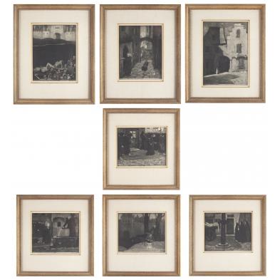 Series of (7) etchings "The Plague", macabre street scenes of an affected town, matted and framed in a conforming manner, signed in pencil lower right "Stephen Eggeler"and titled in plate lower left.