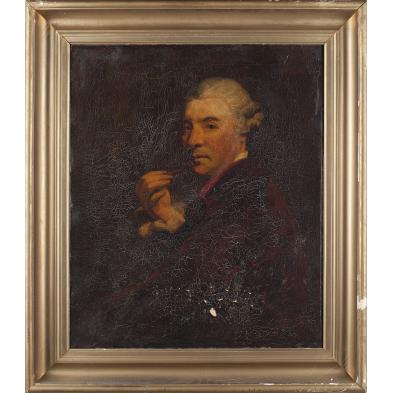 Oil on canvas (lined), Anglo or American school, unsigned, half-length portrait of a gentleman in a wig and holding a pipe to his mouth, a later label on the verso attributes the painting to Gilbert Stuart, housed in a period (possibly original) gilt frame with deep cove molding and later gold paint.