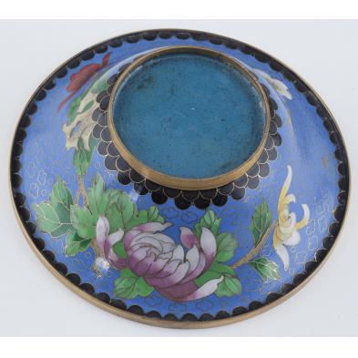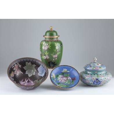 To include: lidded vase with small bird amid cherry blossoms (9.25 in.); bowl with peony motif throughout and toned copper rim (8.25 in. diameter); small bowl with peony decoration (6 in. diameter); lidded bowl with peonies set against a silver background (6 in.).