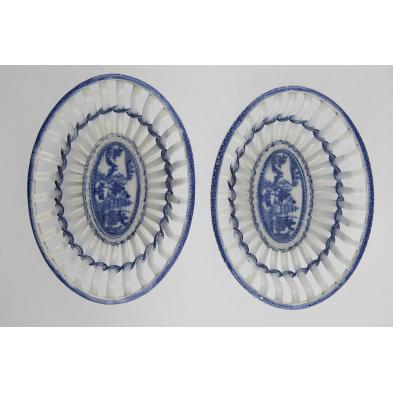 In the "Blue Canton" pattern, likely English or Continental, unmarked; the undertrays with pierced outer rim, basket weave molded interior rim, and center well with transfer decorated scene with cell form surround; the bowls with repeating cell form transfer on rim, delicate lattice form oblong body, and central well with same transfer decorated scene.