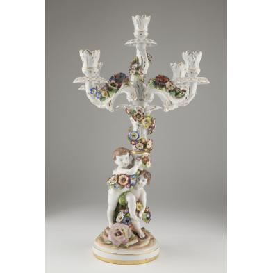 Early 20th century, each in three parts - two putti support the flower strewn shaft which in turn supports a removable four arm / five light candelabra, slight variations to floral and figural decoration to each, both with an overglaze Von Schierholz mark to base, one also with impressed "1039 / 11."