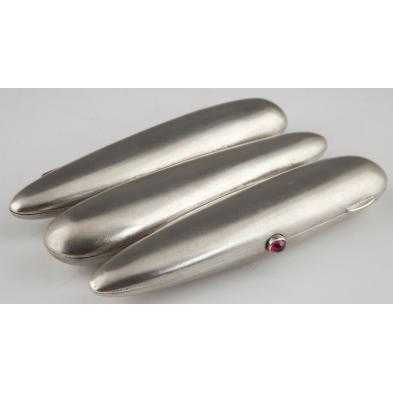 Cased form for three cigars, the exterior with textured surface, the hinged cover with red stone cabochon clasp opens to reveal an opulent gilded interior, partial "84" hallmark on interior.