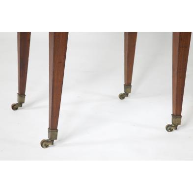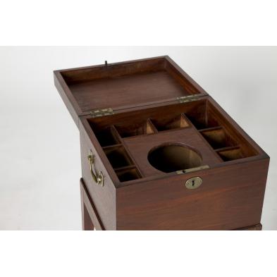 Circa 1800, Virginia, two part form on stand, mahogany case with brass side handles and molded interior divisions.