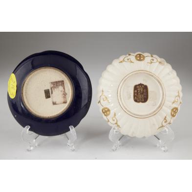 The 8.5 in. dish with surface scrape and area where glaze is lightened; small filled hole to underside.