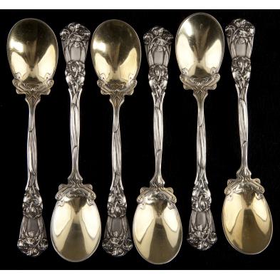 In one of their most popular Art Nouveau patterns, likely berry or ice cream spoons, unusual individual spoons with gold wash bowls retailed by Bigelow & Kennard & Co., no monograms.