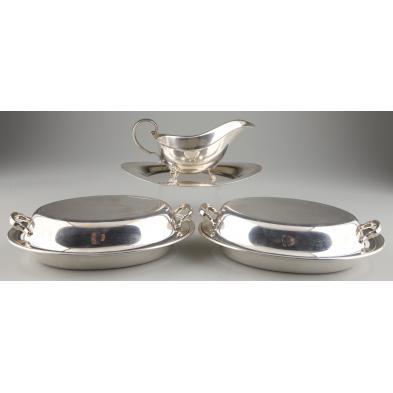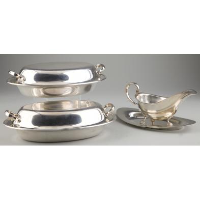 Including a sauce boat and under tray by Frank M. Whiting & Co., pattern # 141 (3.5 x 9 x 5 5/8 in.); and a pair of lidded entree servers by Gorham, pattern # 575 (3 x 10.25 x 7 in.).
