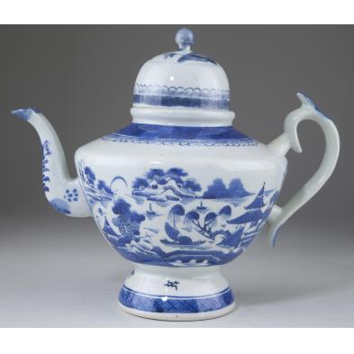Including a mid 19th century teapot with high domed cover in the "Blue Canton" pattern (9 in.) (some roughness to spout); the second a "Blue Canton" milk jug (3.25 in.) (some roughness to rim, handle, spout, and foot); the third a milk jug in the "Blue Fitzhugh" pattern (3.5 in.) (repair to spout, some roughness to foot and handle).