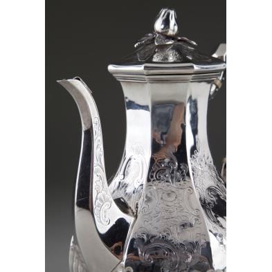 With the sponsor mark of William Ker Reid (1787-1868), London, 1844 date letter, of octagonal pear form, each panel with finely engraved floral and foliate decoration, fluting to lower belly, raised on four pierced foliate scroll feet, fruit form finial.