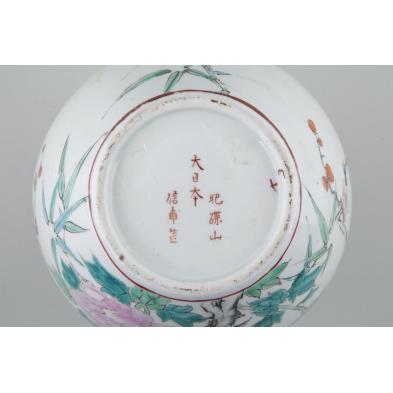 Late 19th century, signed on underside by Hichozan Shimpo in red characters, floral and avian themes are beneath a collar with segmented geometric designs.