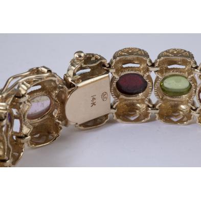 Beautifully and colorfully designed as a line of oval shaped cabochon gemstones including topaz, ruby, peridot, citrine, sapphire, emerald, amethyst, rubellite and pink tourmaline, and garnet, which are surrounded by gold half circle shaped links with pierced heart decoration, mounted in 14KT yellow gold.