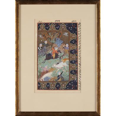 19th century, gouache on paper, each depicting hunters and their prey in a landscape with bold blue and gold border, script visible on the edges, each matted and framed under glass.
