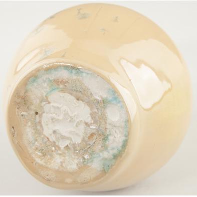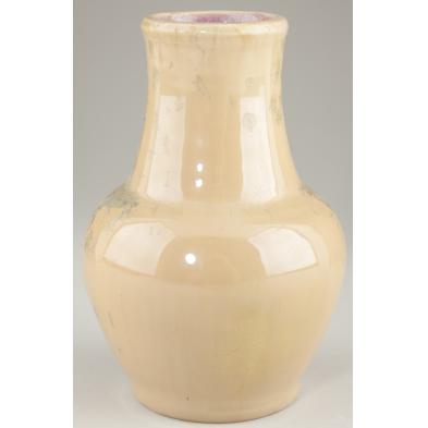 A bottle vase and a baluster vase, mellow tan field with large blue and/or green crystals, pink interior, impressed stamp on the bottom, no date to the bottle vase, the baluster vase dated 1936.