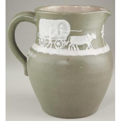 Allover olive green matte glaze, the upper portion decorated with the popular cameo Western scene and signed in slip to the right of the handle, "Stephen 1951," cream interior. The bottom also with impressed stamp.