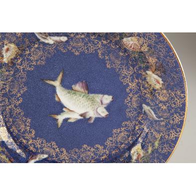 (4) pieces, England 1920s, a powder blue plate with fish and shell decoration (9 in.); a footed custard dish with butterfly motif (3 x 4 in.); a bowl with powder blue interior and enameled butterflies to the exterior (1.5 x 6 in.); and a small footed dish decorated with a turtle (1 x 3.75 in.).