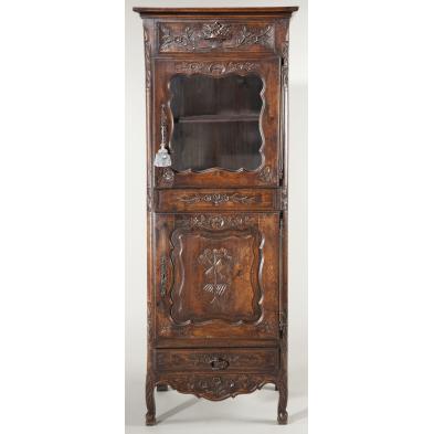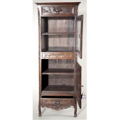Late 19th century, oak, having a molded cornice over a carved floral basket frieze which surmounts a single glass fronted hinged door over a single blind door carved with a musical instrument motif, single full-width lower door, the case raised on shaped feet.