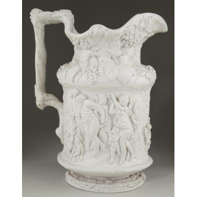 A grey stoneware jug, English, mid-19th century, "Bacchanalian Dance" featuring a continuous scene of revelry based on a painting by Peter Paul Rubens. Bottom marked only with an impressed "49."