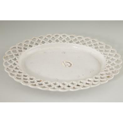 English, circa 1760, oval reticulated form with scalloped rim, applied scrolled loop handles, basket weave sides. With conforming stand.