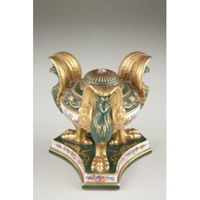 French, 19th century, an inkstand and (2) portrait vases, all with green field and gilt decoration, the vase portraits each signed "Rochelle"; one a depiction of Marie Louise and the other of Josephine, mounted on a shaped bronze plinth. The inkstand is of a circular form supported by (3) griffins with removable lidded well. All with red mark to bottom.