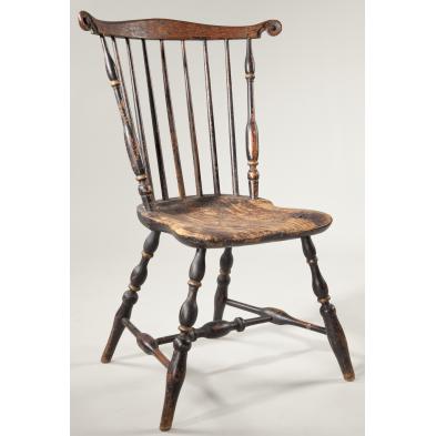 Circa 1800, having a comb piece with volute carved ears over (7) plain spindles flanked by baluster turned outer spindles, shaped plank seat, baluster and ring turned splayed legs with "H" stretcher base. Woods appear to be white pine and oak with old painted surface.