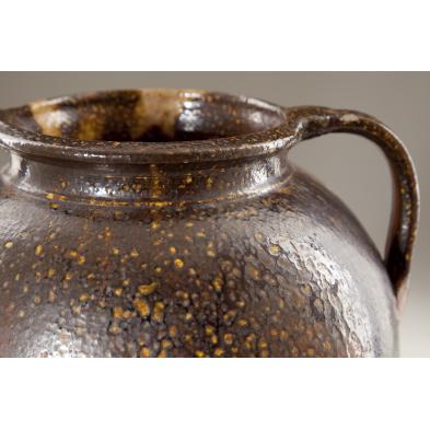 Circa 1930s, ovoid tapered form with double applied strap handles, one side and rim somewhat overfired.