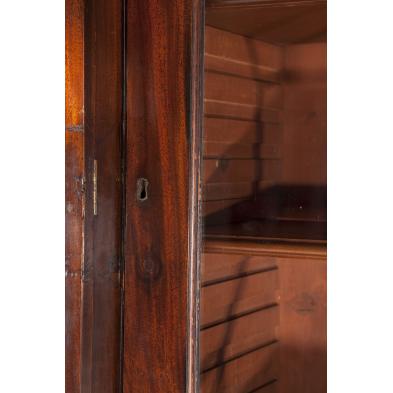 First half 19th century, carved mahogany, double cove-molded cornice over (4) astragal mullioned doors each with (14) panes and a shelved interior. The base cupboards feature flame mahogany panels outlined in raised molding and have either a drawer or shelved interior, on a flush base.