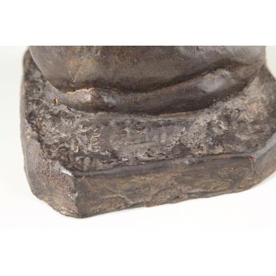 Likely American school, inscribed with artist's initials on base "NE;" the woman is depicted kneeling, one hand held against her midsection, the other resting casually on her thigh, her charmingly modeled facial features indicate a laugh; with bronze tone finish.