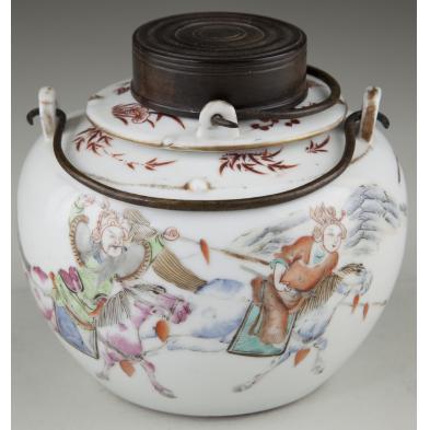 The first a double walled wine warmer, the outer pot has hand-painted scenes of warriors on horseback, the inner cylindrical body hand-painted with courtyard scenes, both sections with iron handles, later wooden cover (4.25 in.; small chip to spout); the second a helmet form cream jug with hand-painted Arita style decoration (5.25 in.; old hairline to spout, some roughness to one side of lip).